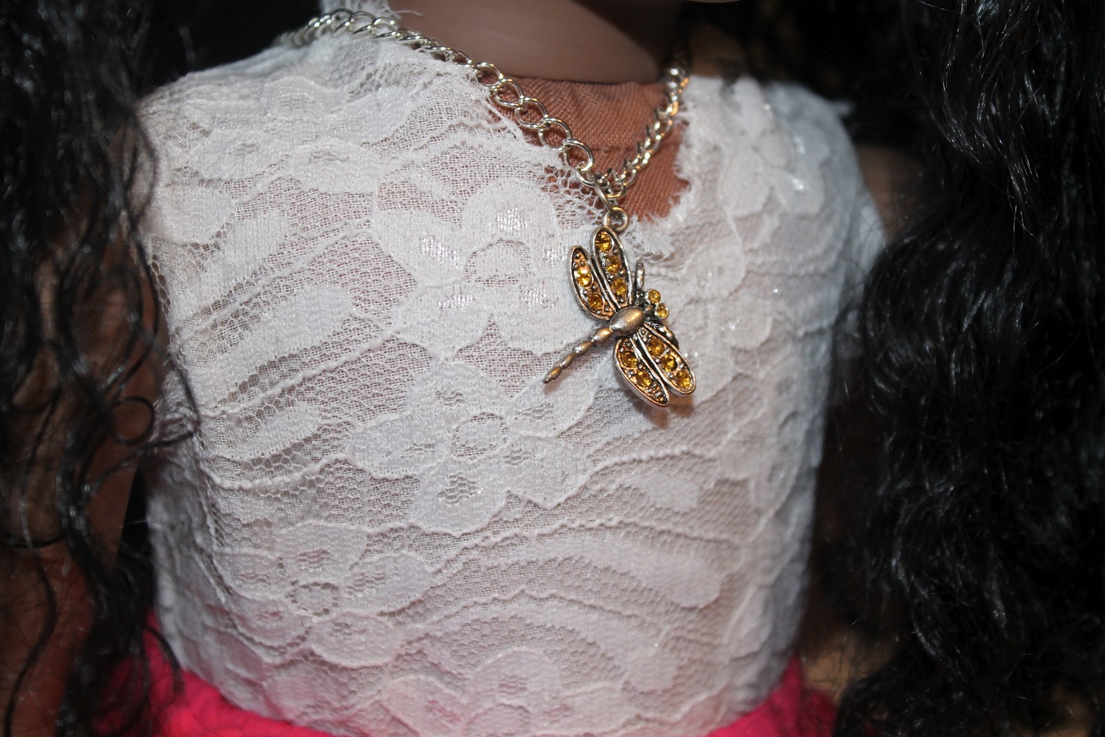 I made this necklace with some jewelry findings I have laying around and it was simple, just like making a necklace for us, except in a much smaller size. And this lace fabric came from a shirt that was no longer being used.